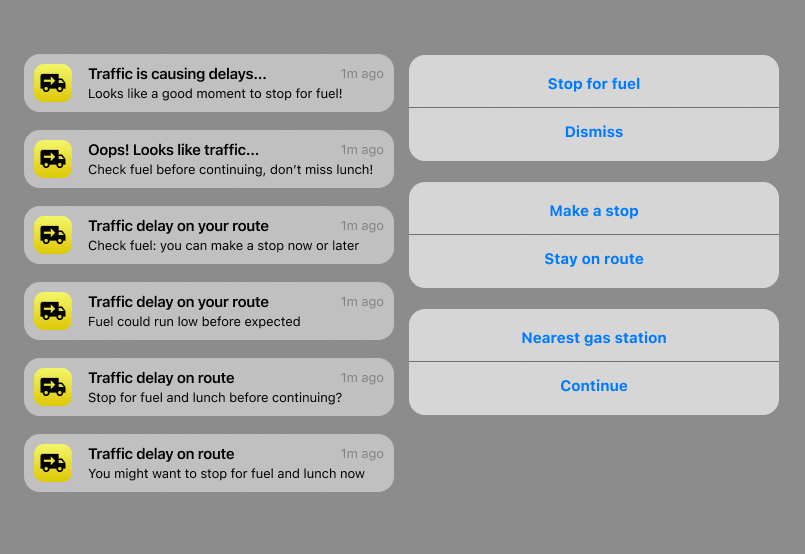 Redacté diferentes mensajes, abordándolos de forma diferente y usando todos los elementos para comunicar lo máximo posible. Quise que cada parte de la notificación (head, body y botones) comunicase algo distinto y no hubiese redundancias.