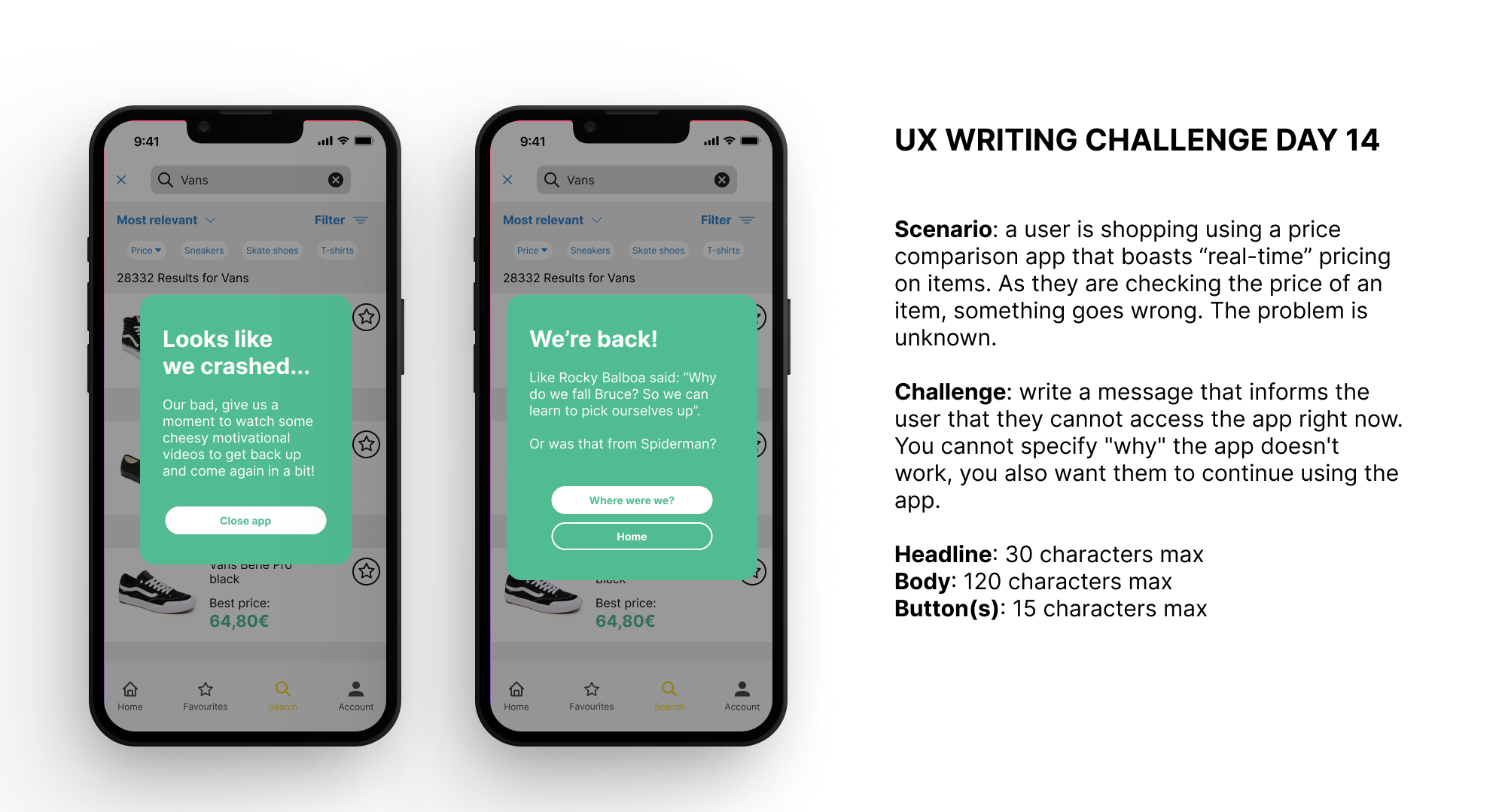 Esta vez no use ninguna herramienta de empatía previa, simplemente escribí muchos mensajes hasta ir encontrando aquellos que más me fuesen gustando. Quise que el mensaje no hiciese sentir al usuario culpable al mismo tiempo que usaba algo de humor para quitar peso a la situación.
