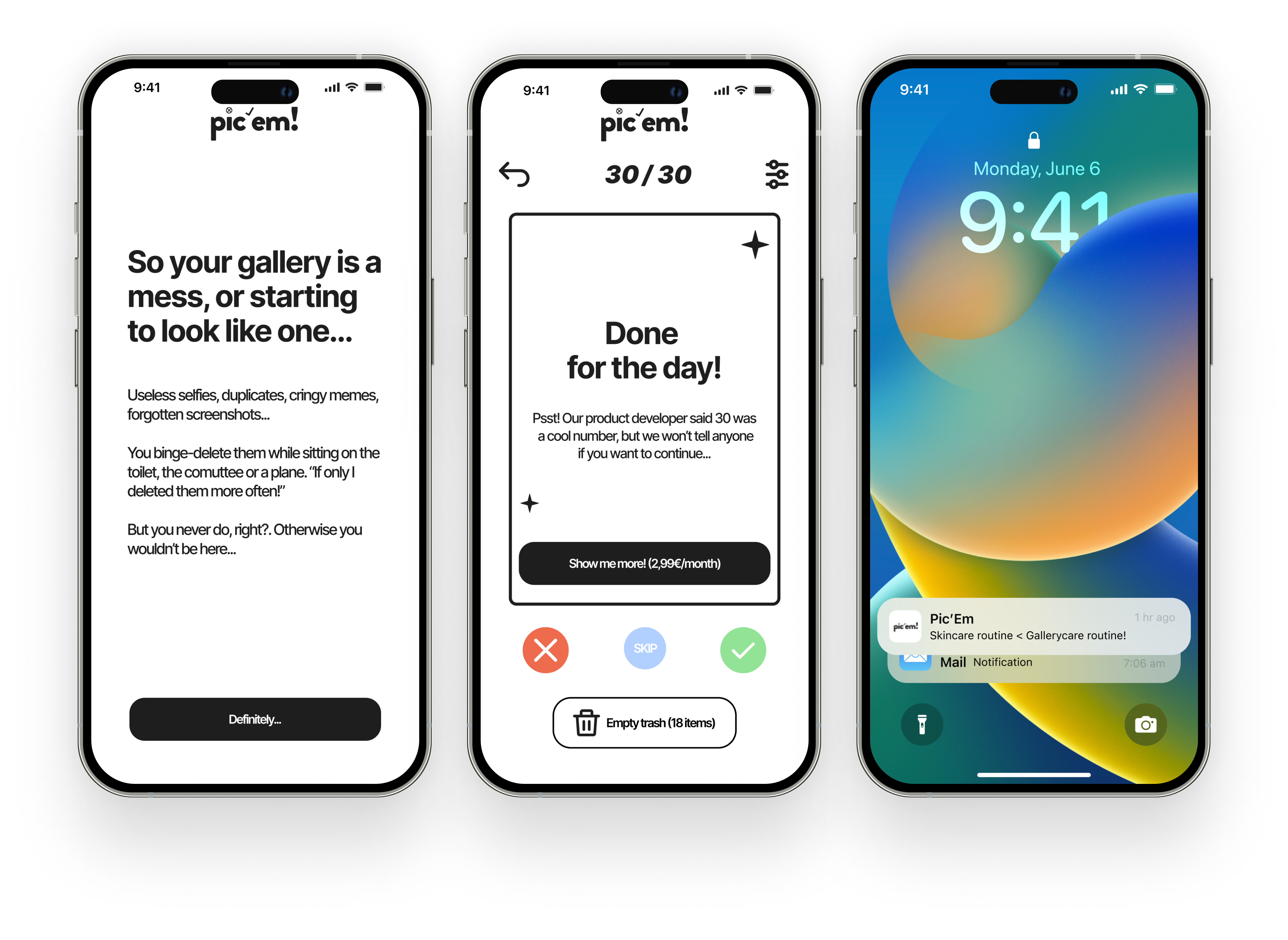 Tras varias iteraciones, revisiones y compartir mis avances con conocidos dentro del mundo del UX, decidí simplificar las acciones a 4: borrar, conservar, saltar (para aquellas fotos en las que el usuario dudase) y retroceder. La interfaz también cuenta con un botón para vaciar la papelera (Pic’Em no borra nada automáticamente, esa decisión corresponde al usuario) y un menú desplegable para “filtrar” según diferentes categorías de archivos, otra de las funcionalidades que más interesaba a los encuestados.