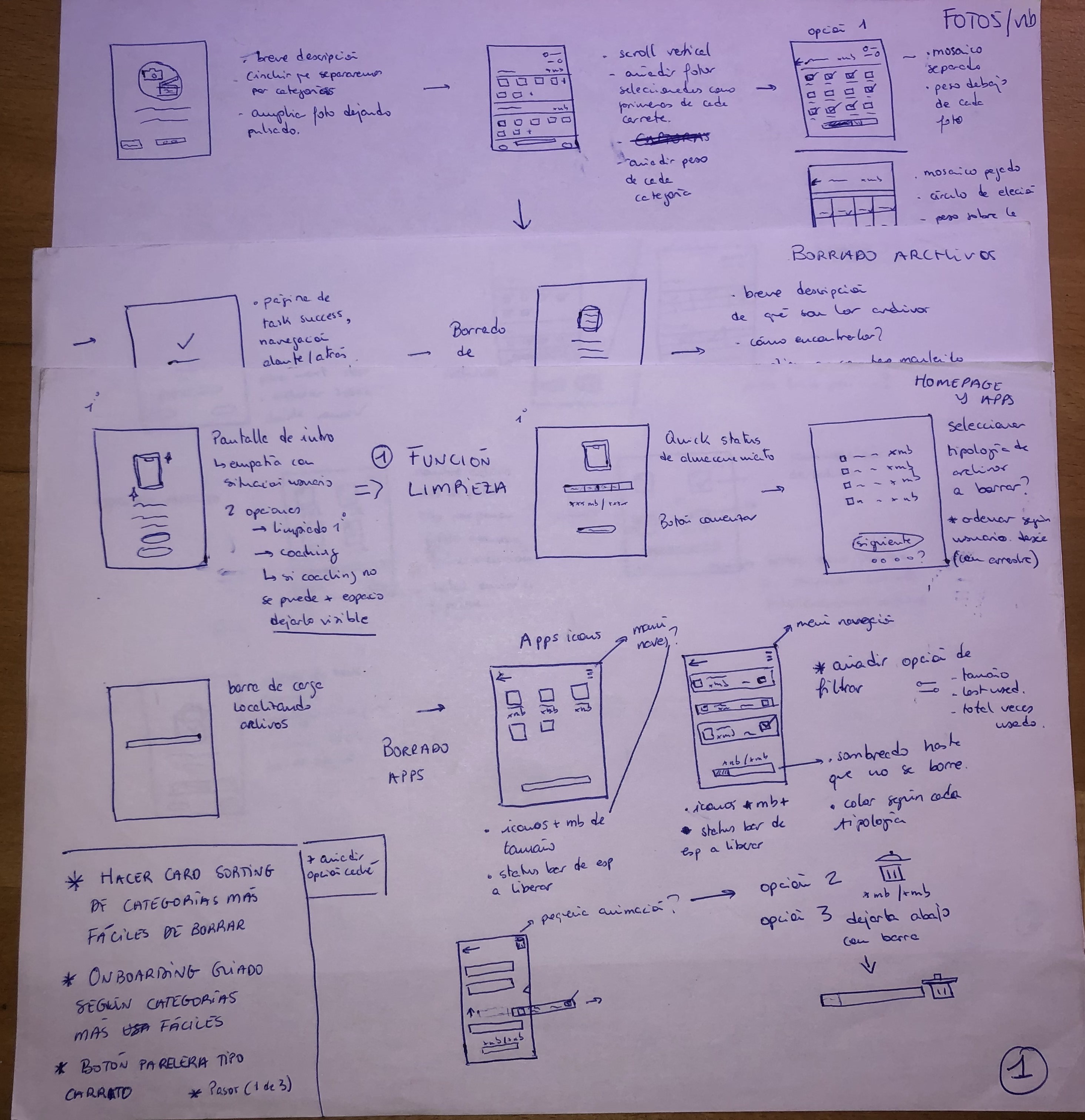 Tras la investigación empecé a tener claro que lo que más podría servir al usuario sería ayudarle a generar y mantener una rutina de limpieza que le costase poco esfuerzo. Investigando entre diferentes apps de la competencia, vi que todas se centraban en ofrecer borrados “masivos” y dar información sobre el estado del almacenamiento del smartphone.