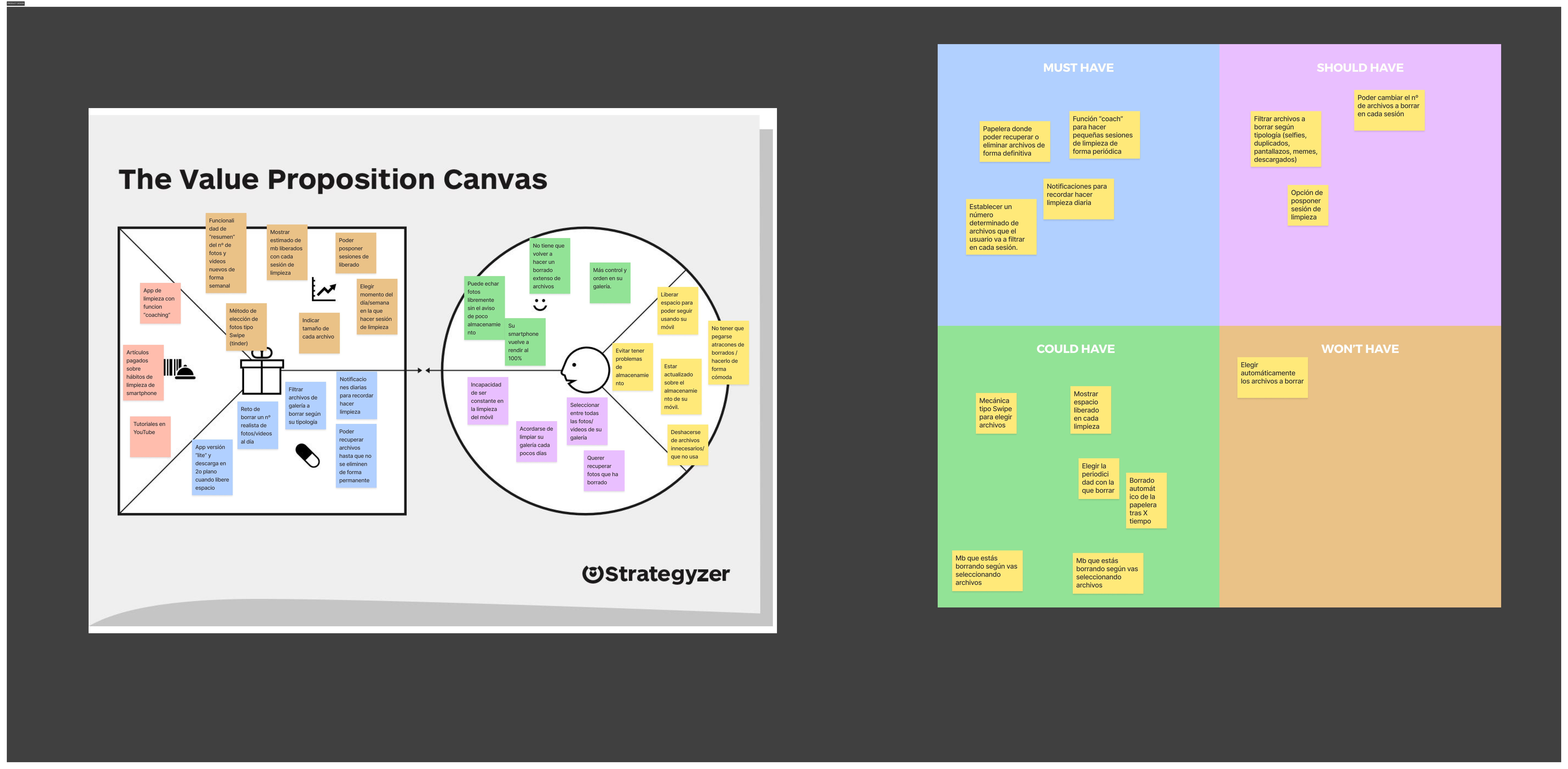 Con la información reunida en la investigación empecé a idear cuál sería mi solución. Primero usé el Value Proposition Canvas y el MOSCOW para ir acotando el tipo de producto y sus funcionalidades.