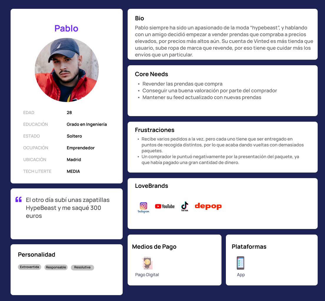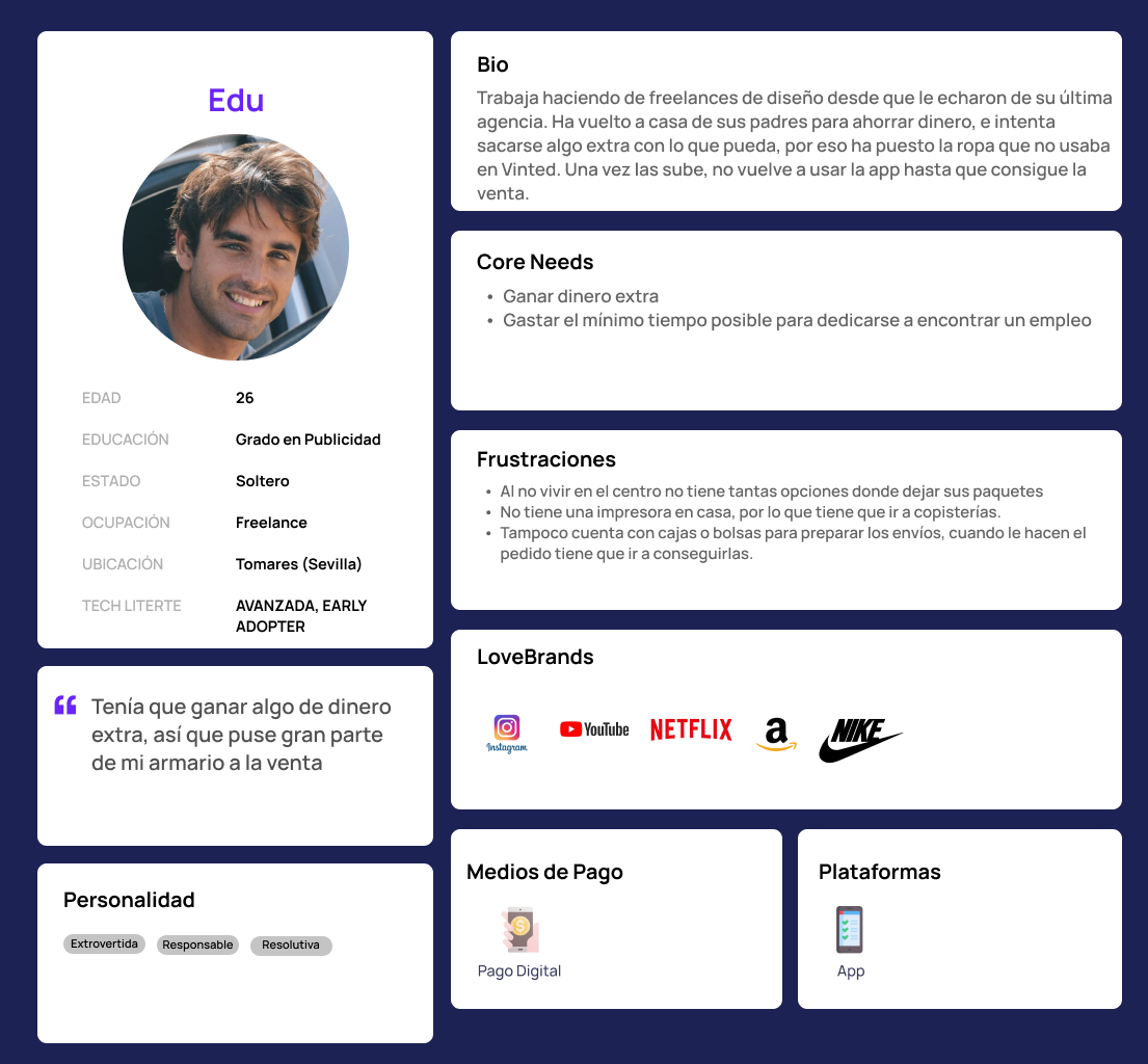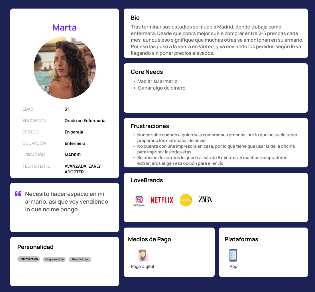 A través de los user persona pudimos dar voz y cara a diferentes tipologías de usuarios que usan Vinted con objetivos similares, pero a la vez con pequeñas diferencias. Esto sería crucial a la hora de validar una nueva funcionalidad que sirviera a todo tipo de usuarios.