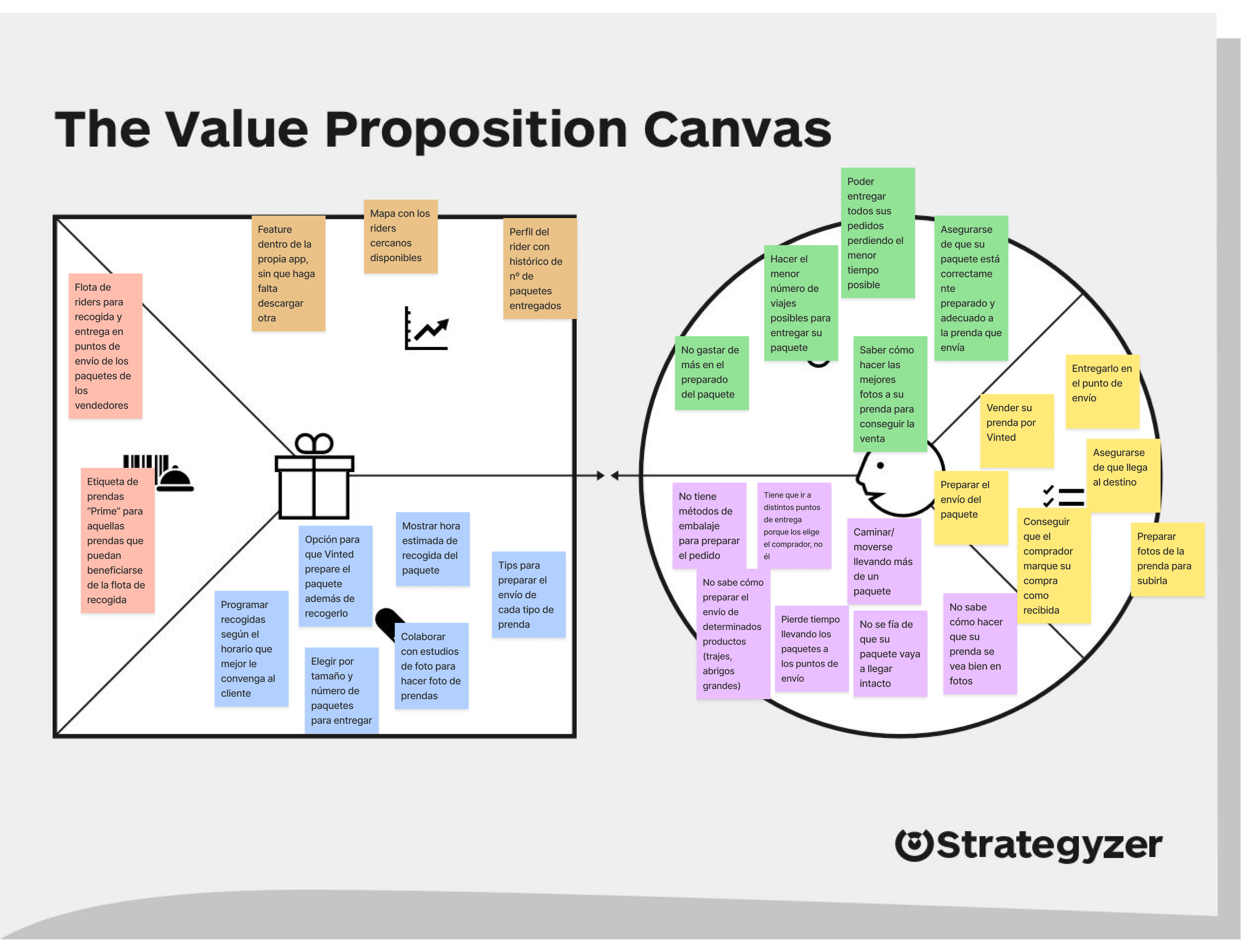 Las conclusiones obtenidas a través del research dieron pie a empezar a plantear nuevas funcionalidades para Vinted que respondiesen a las necesidades de los usuarios. Para acotar más, se planteó un Value Proposition Canvas que arrojase diferentes ideas y un MOSCOW que terminase de definir aquellas que serían esenciales.