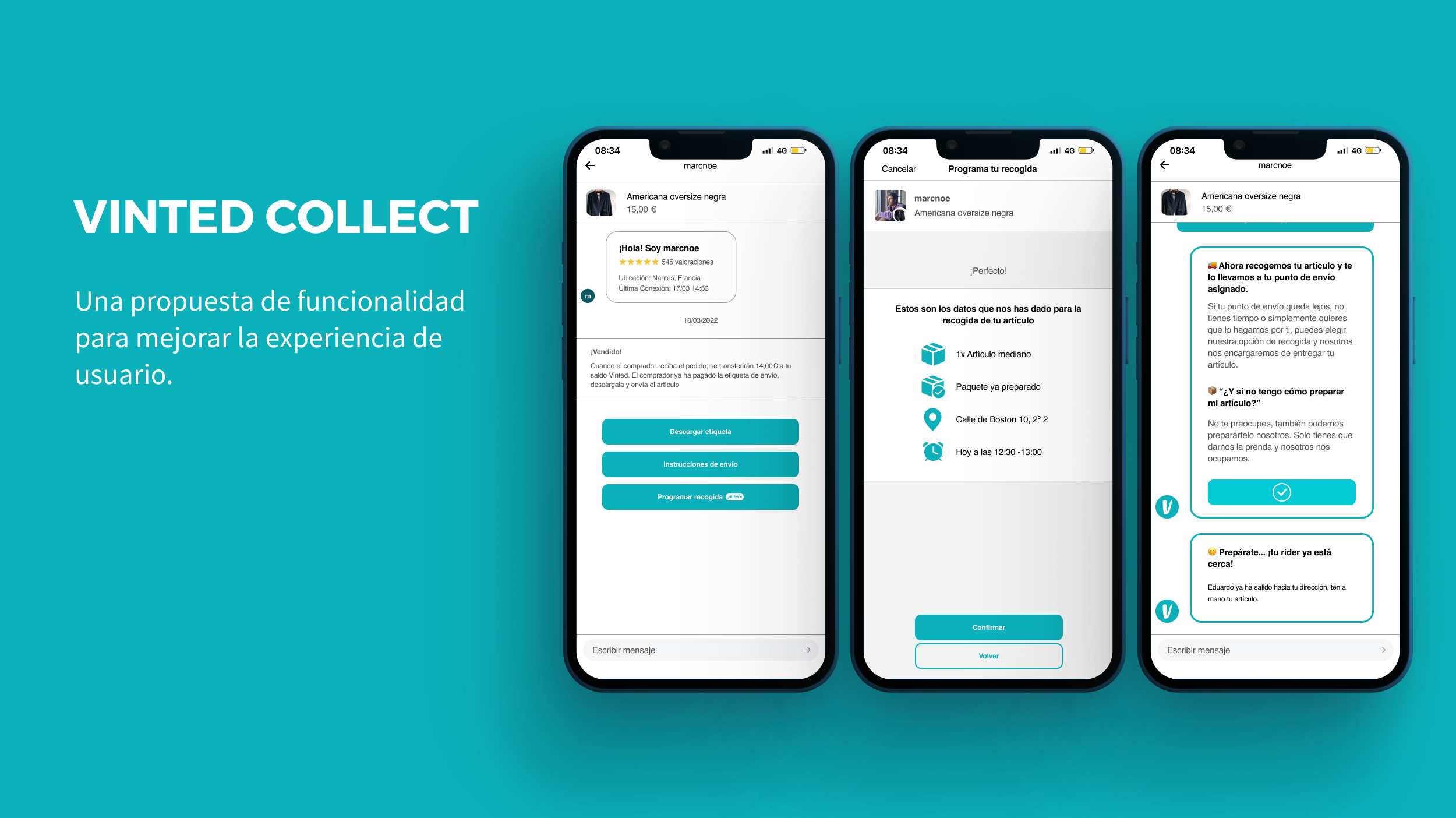 Finalmente se diseñó Vinted Collect, una propuesta de funcionalidad para Vinted que ayudase a los usuarios, de forma opcional, a entregar sus artículos vendidos en los puntos de envío a través de un sistema de recogida y entrega mediante riders.